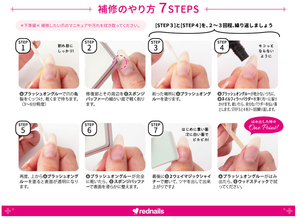ブラッシュオングルー(瞬間接着剤)で爪を接着、ネイルフィラー(補修パウダー)で上から覆い、補強します。