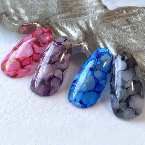 普通のジェルでは表現が難しかったニュアンスアート、ぼかしアート、たらしこみ、天然石アート、水彩アートが簡単にできます。インクなので厚みが出ず、キレイに仕上がります。