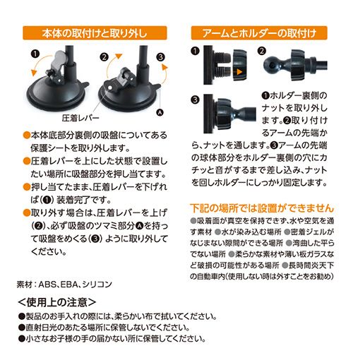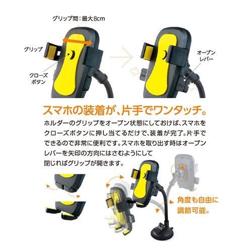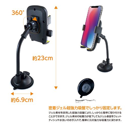 密着ジェル付き超強力吸盤でしっかり固定。フレキシブルアームで角度も自由に調節可能。