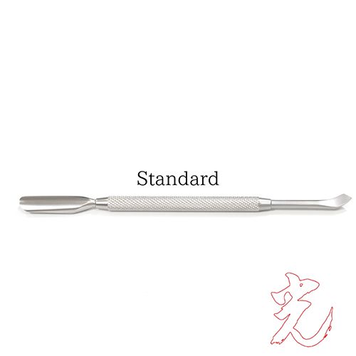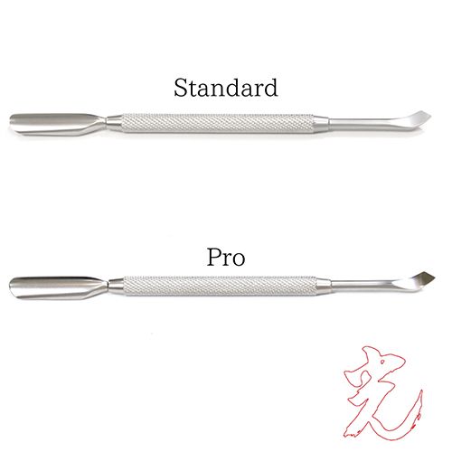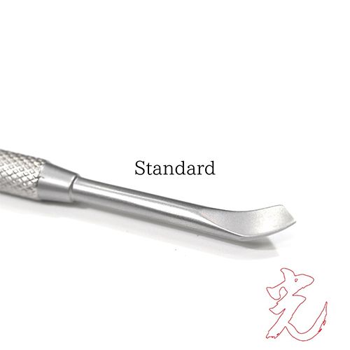 通常のプッシャーは、焼き入れ処理をしていないため硬度が20度ほど(HRC)と とても柔らかく、数週間に1度ファイルで研磨をしなければ使えませんが、このプッシャーは焼き入れ処理をすることで硬度が50度(HRC)まで入れることが可能です。シザー並みの硬度が入るため、ファイリングをしなくても長く使える仕様です。
