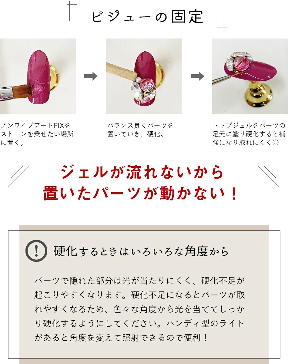 パーツをジェルで覆う必要がなく、ストーンの輝きはそのままにガッチリ固定できます。