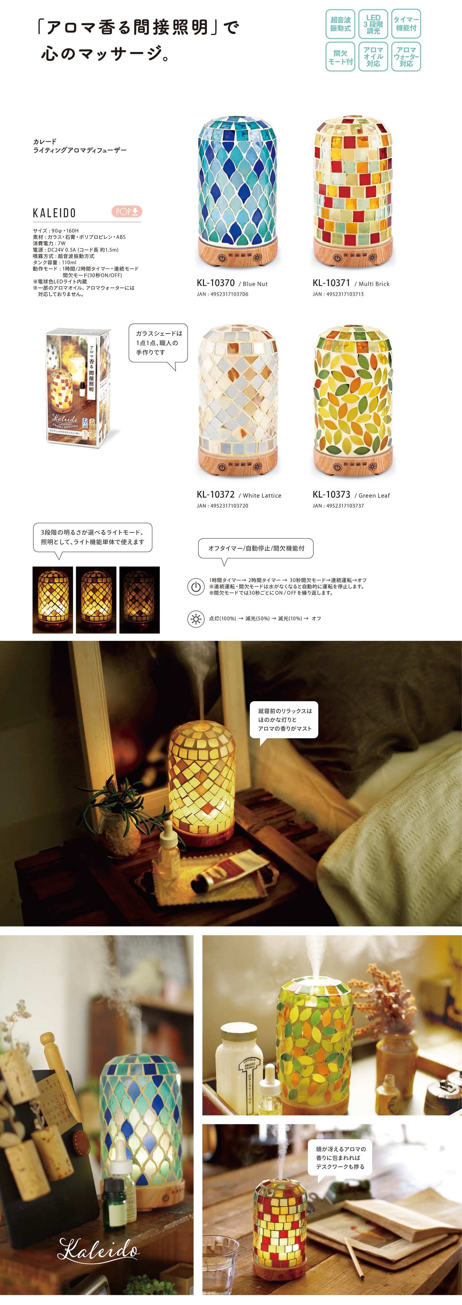 アロマ香る間接照明で心のマッサージ。1つ1つハンドメイドで作られた美しい色と模様のモザイクシェードは幻想的な雰囲気を演出します。アロマディフューザーとしての機能性はもちろんインテリアライトとしても満足の一台です。