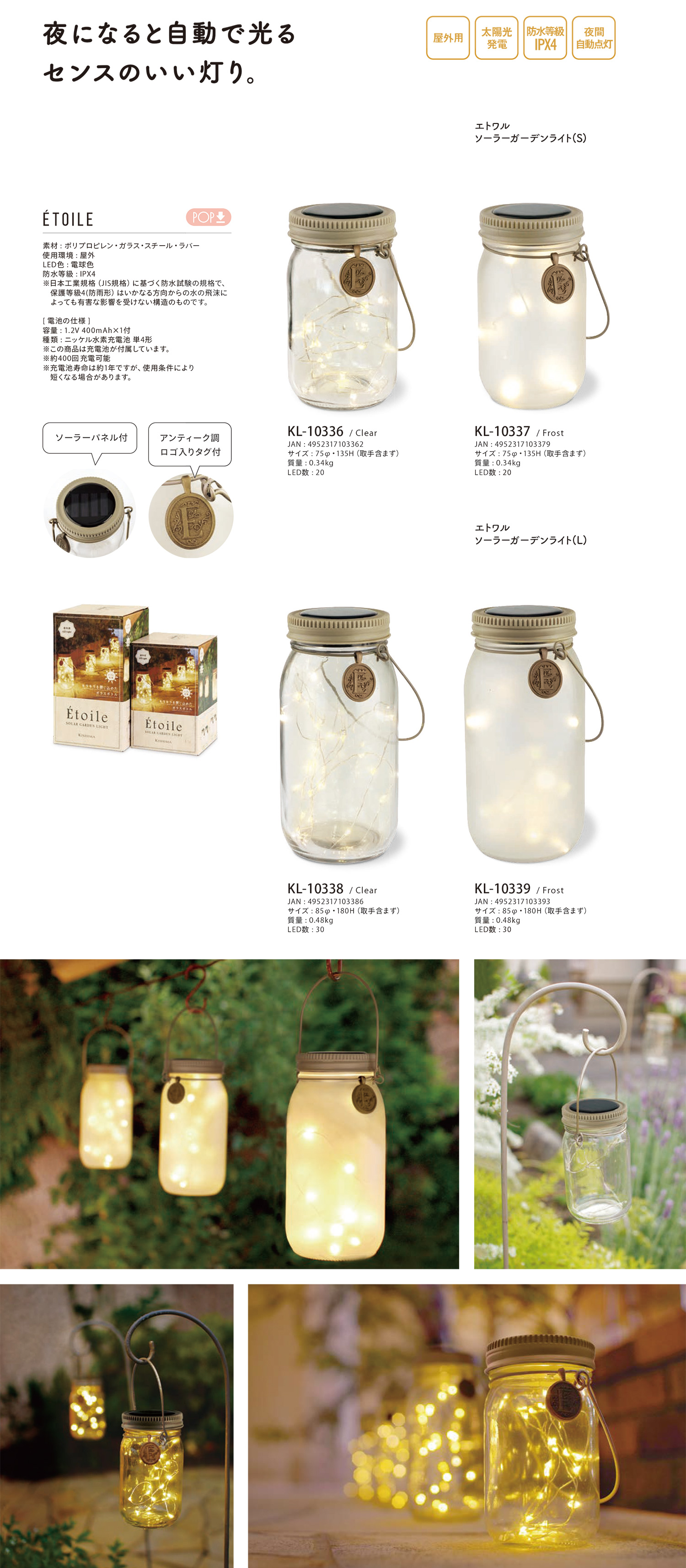 ソーラー充電で暗くなるとアンティーク調の瓶に入ったフェアリーライトがキラキラと輝きます。