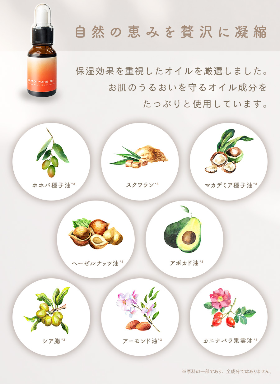 ホホバ種子油、スクワラン、マカデミア種子油、メドウフォーム油、コメ胚芽油、ヘーゼルナッツ油、シア脂、アボカド油、ツバキ種子油、ブドウ種子油、アーモンド油、月見草油、カニナバラ果実油、グレープフルーツ果皮油、オレンジ果皮油、トコフェロール、ジパルミチン酸アスコルビル
