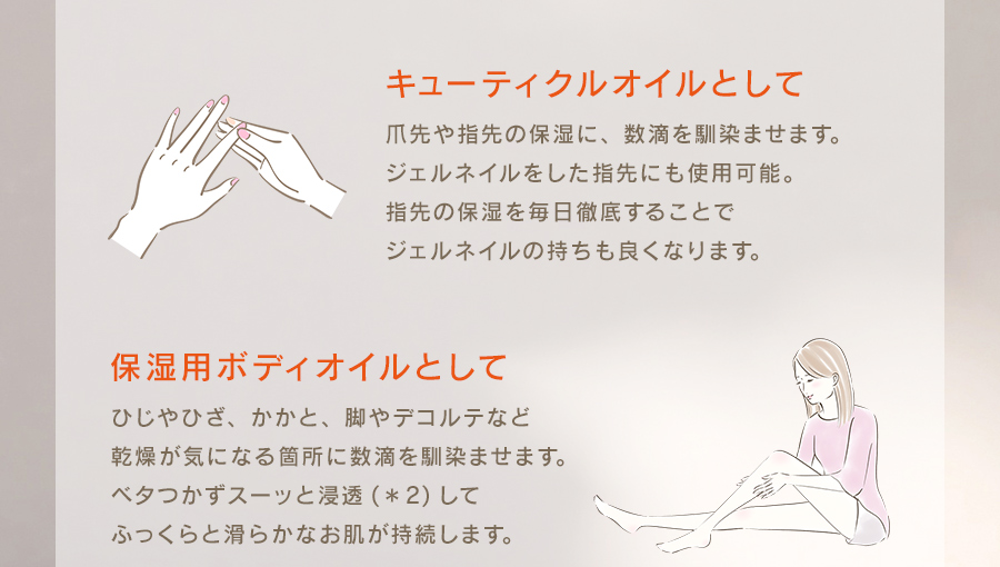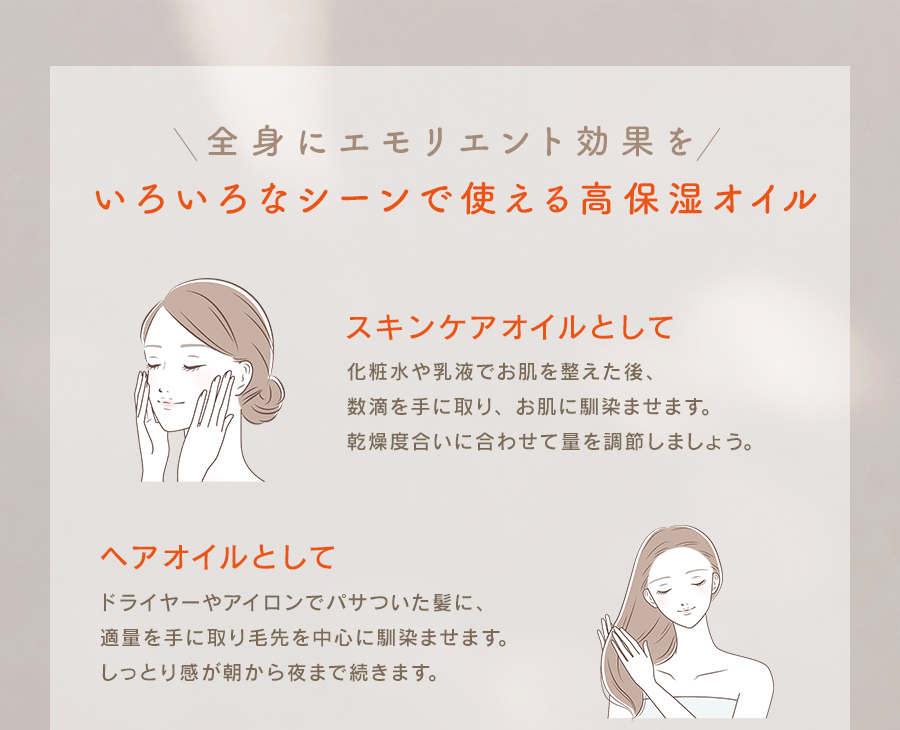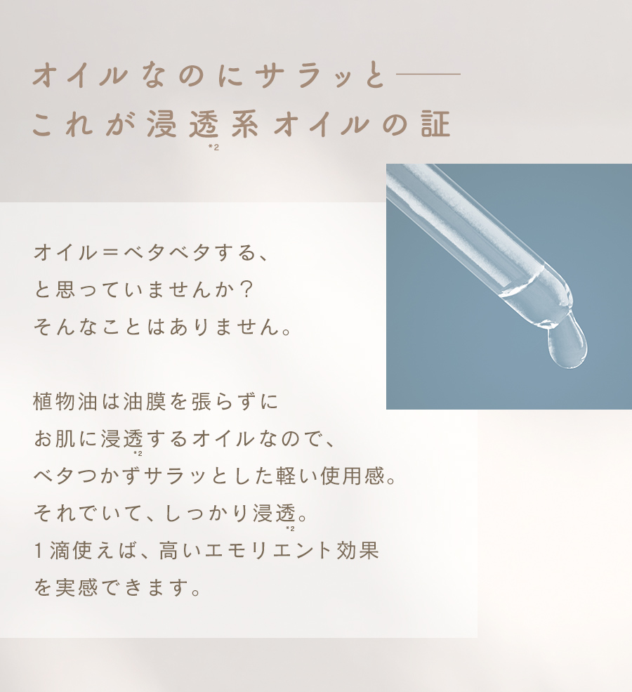 オイルとは思えないほどのサラサラ感で、使い心地の感触がさらに良くなりました。オイルなのにベタつかず、ベタつかないのにしっとり保湿します。