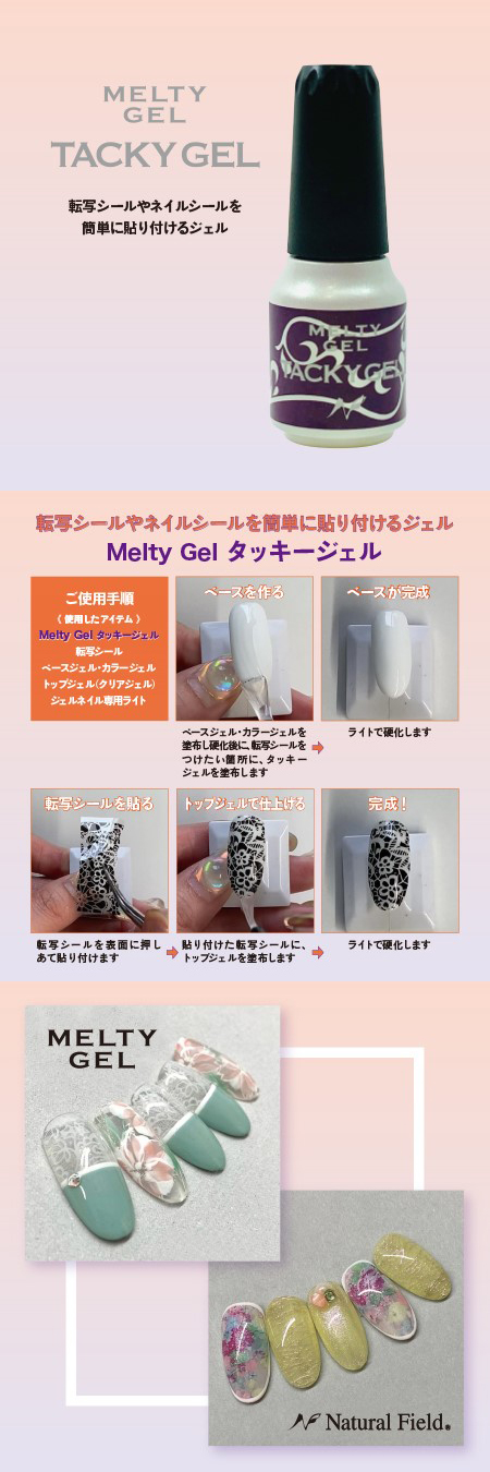 粘着が残ってしっかりくっつくホイル転写用クリアジェル。シールやストーンをのせるのにも使用できます。ホイルやシールの貼りたい場所にジェルを適量塗布し硬化すると、粘着力のある未硬化ジェルが残る為、ホイルやシールをしっかりくっつけてくれます。お爪に全面のホイルも隅々までキレイに貼れます。ホイルが付きづらい爪の端や曲線ラインでも、未硬化ジェルがしっかりと密着するため、シートをムラなく美しく貼ることができます。サラッとした塗り心地で使いやすく、ネイル初心者さんでも安心して使えます。