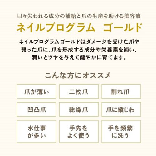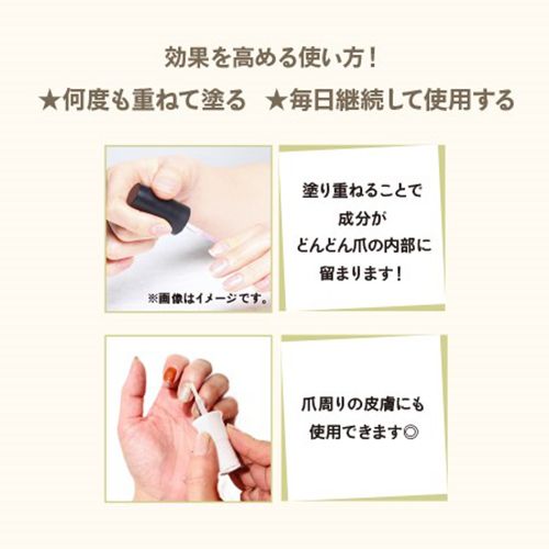 爪と同様の成分を複数配合し、爪や肌から日々失われる成分補給と、生成能力を補助する保湿効果の高いツメ美容液です。