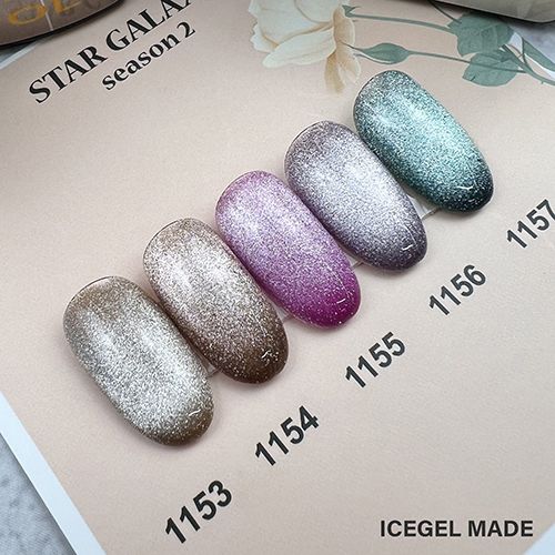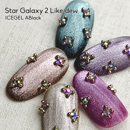 ラメ系カラーの上に、マグネットスティックで引き出すホワイトパール系キャッツアイが幻想的な輝きを放つキャッツアイカラージェル。