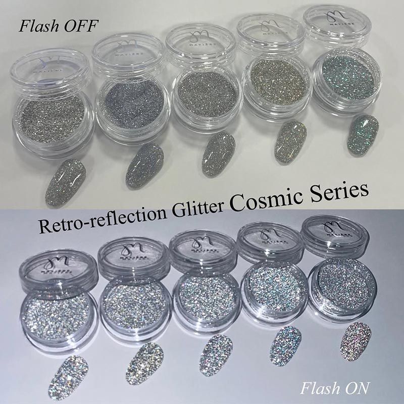 光りを当てる事で、より一層のキラキラ感を楽しむ事ができます。こちらはシルバーをベースに色を加えたコスミックシリーズ。
