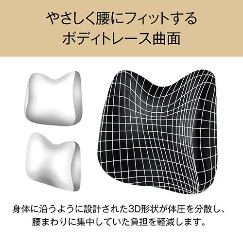 やさしく腰にフィットする 3D形状で自然と正しい姿勢に導き、ドライブ中の身体の負担を軽減する。
