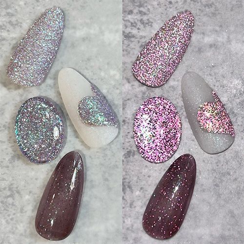 振りかけるのもキラッキラで良いですが、クリアジェルに混ぜたのを他のカラージェルに重ねるのもすごく綺麗でした。
