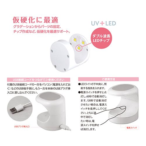 LEDライトの下中央に照射する指先を入れて電源スイッチを押すと点灯し、60秒で自動消灯します。120秒で自動消灯したい場合は電源スイッチを長押ししてください。