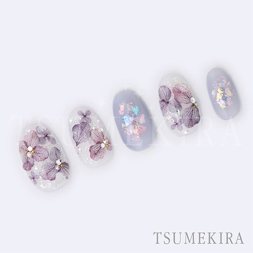 大人可愛いカラーで、本物の花びらを埋め込んだような、紫陽花ネイルを楽しんでいただけます。