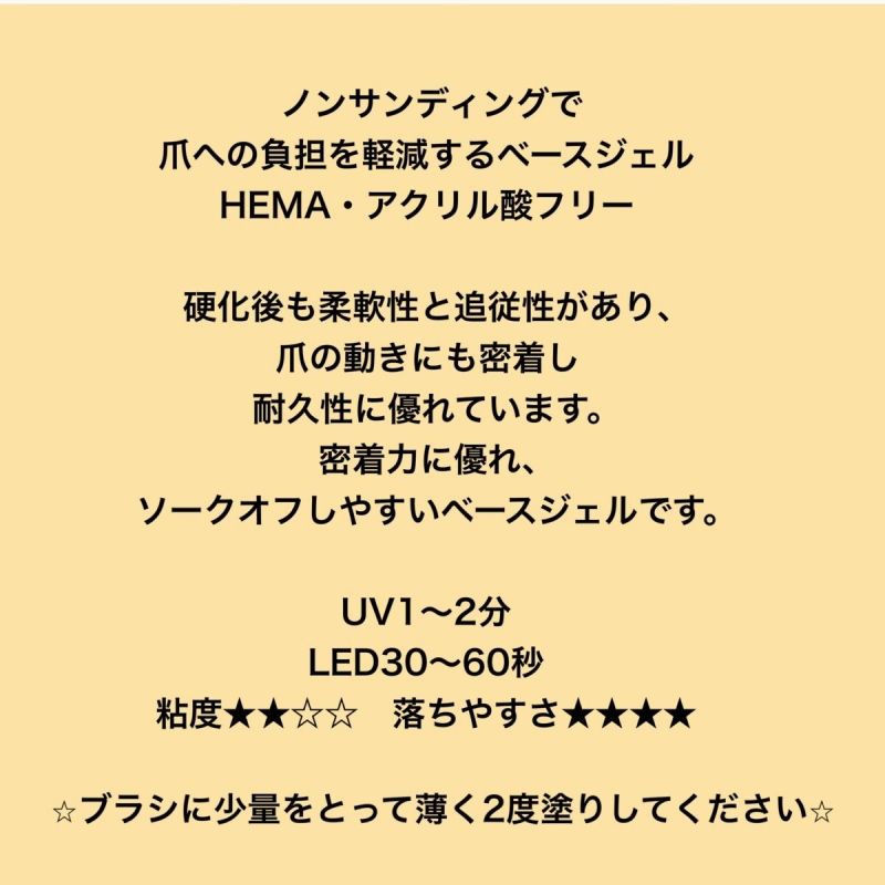 2回目の購入。正直、私の爪と相性が良くないのですが笑、オフの時にふわっとなるタイプのベースです。チップの長さ出しする時にオフしやすいのでこちらで付けてます。チップがポロっと取れる事は今のところないです。