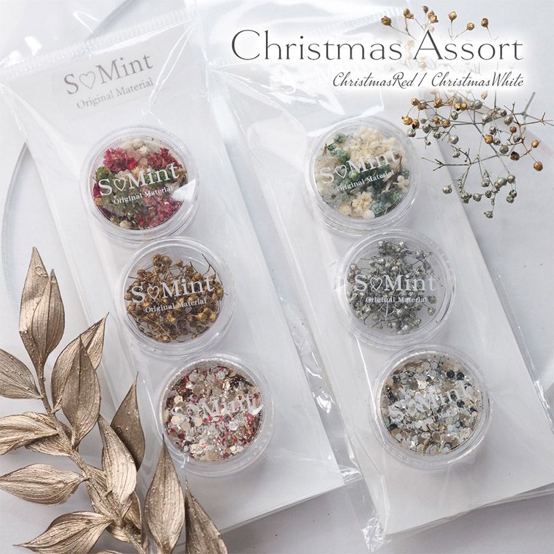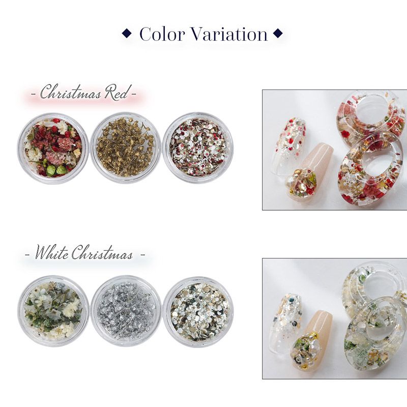 ミックスフラワーと、クリスマス作品作りには欠かせないミニカスミソウ、爪に塗るだけ・レジンに混ぜるだけでTHEクリスマスになっちゃうミックスグリッターの3個セット!