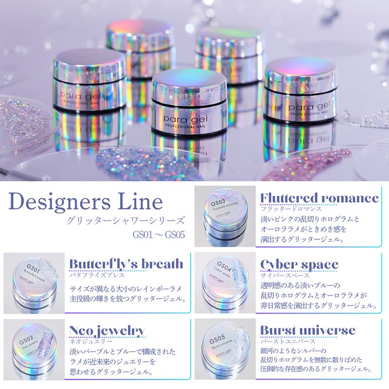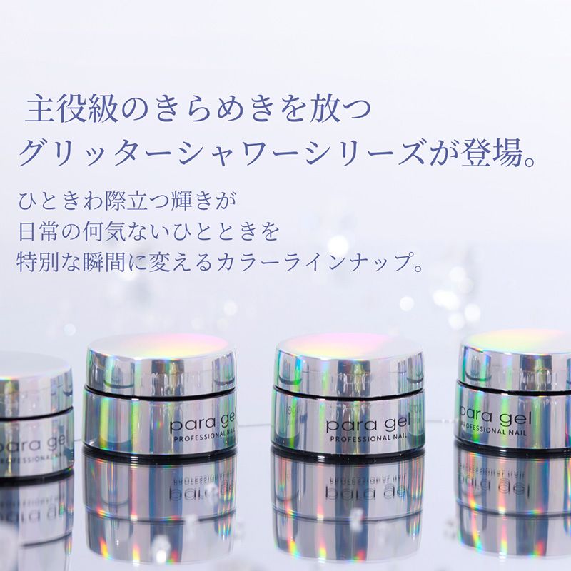主役級のきらめきを放つグリッターシャワーシリーズ。ひときわ際立つ輝きが、日常の何気ないひとときを特別な瞬間に変えるカラーラインナップ。銀河のようなシルバーの乱切りホログラムを無数に散りばめた圧倒的な存在感のあるグリッタージェル。