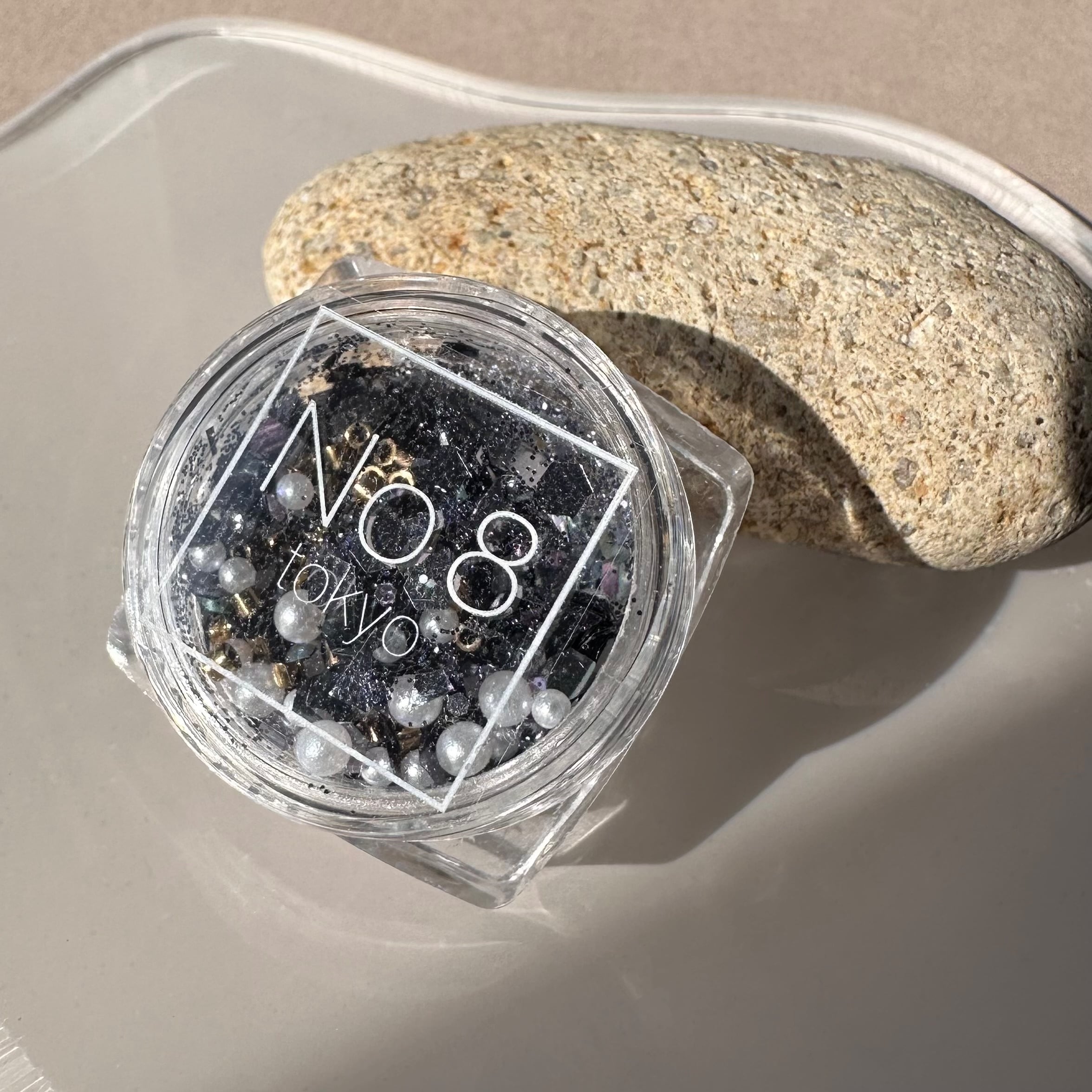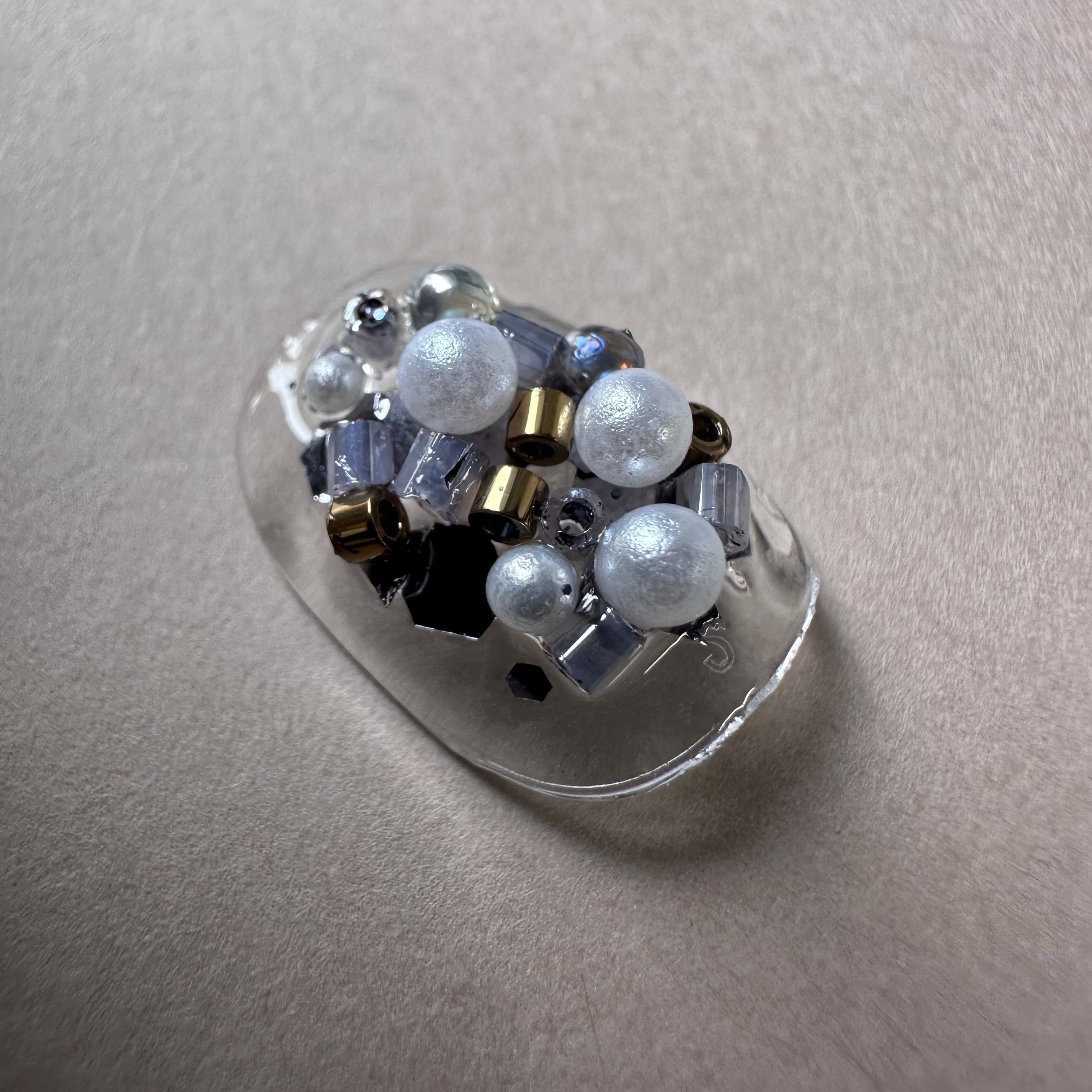 「グレー」は、六角ブルーグレーホロ・乱切りブルーグレーホロ・クリアブルーグレービーズ・ゴールドビーズ・球体パール・球体メタルボール・グリッターetcが入っています。