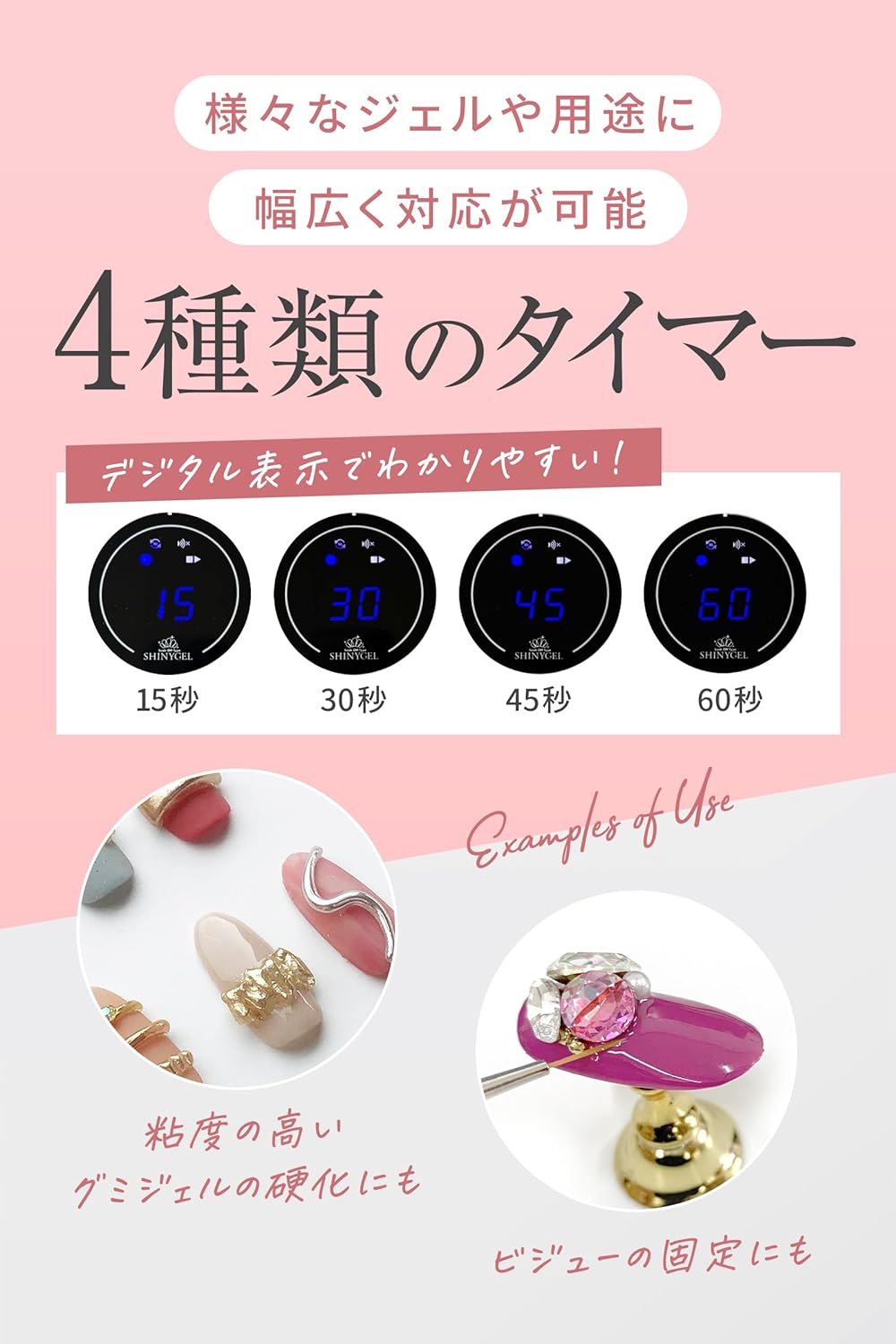 また硬化も「15秒」「30秒」「45秒」「60秒」と4パターンものデジタルタイマーがついているので、様々なジェルに幅広く対応できます。