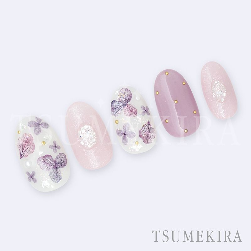 大人可愛いカラーで本物の花びらを埋め込んだような、紫陽花ネイルを楽しんでいただけます。