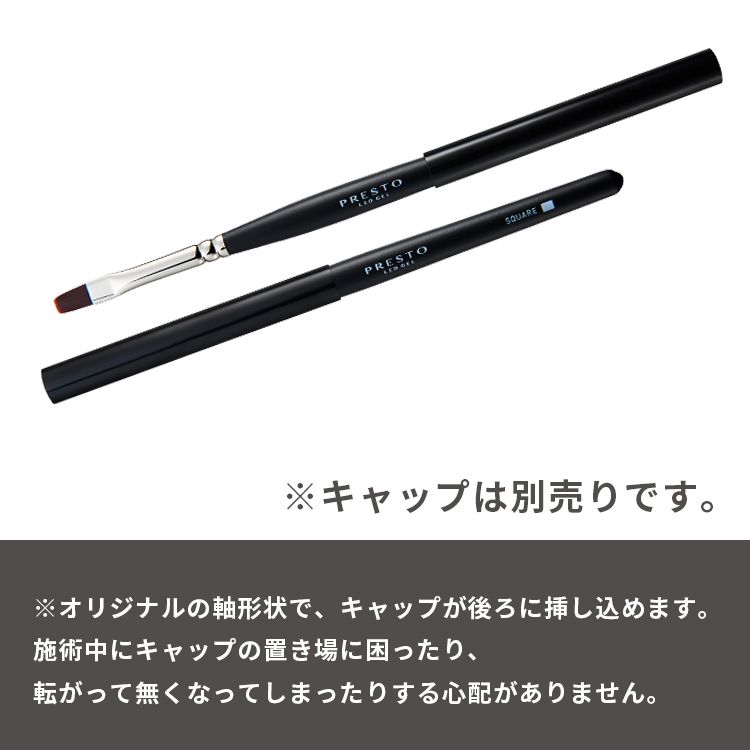 PRESTOのジェルブラシは、オリジナルの軸形状でキャップが後ろに挿し込めます。施術中にキャップの置き場に困ったり、転がって無くなってしまったりする心配がありません!