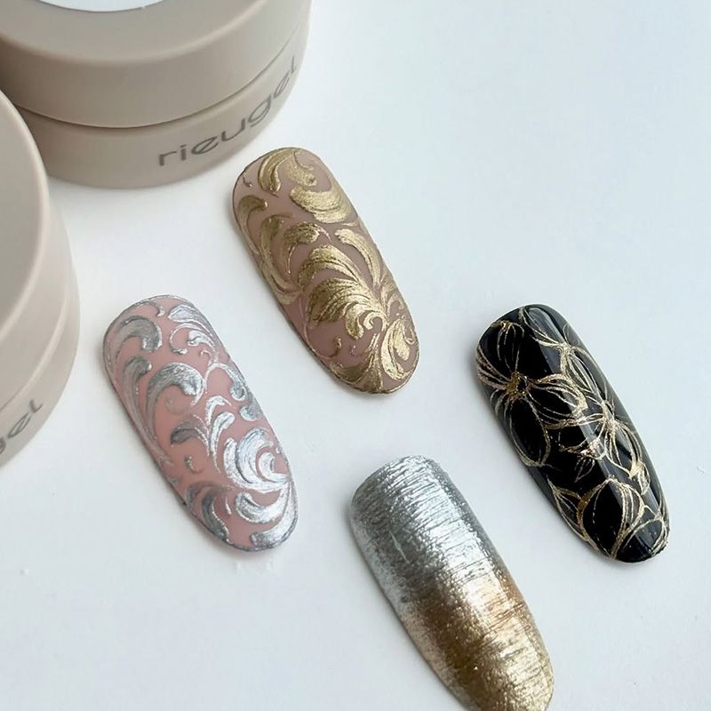 ラインアートのための『JOJO』シリーズ待望のsilver。滑らかなテクスチャーで細ラインをフラットにも立体的にも作ることが可能で、メタリック感もあるのに剥げない優れもの。ミラーパウダーもしっかり定着。