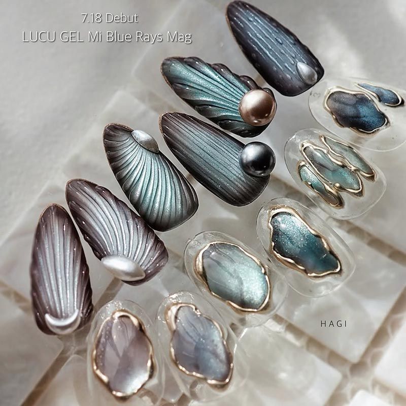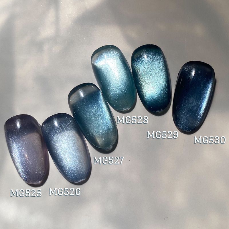 「Blue Rays Mag」は、ブルーに光るマグネット粒子と、みずみずしい透明感のある6つのニュアンスカラーで構成された繊細で神秘的なマグネットジェルシリーズ。