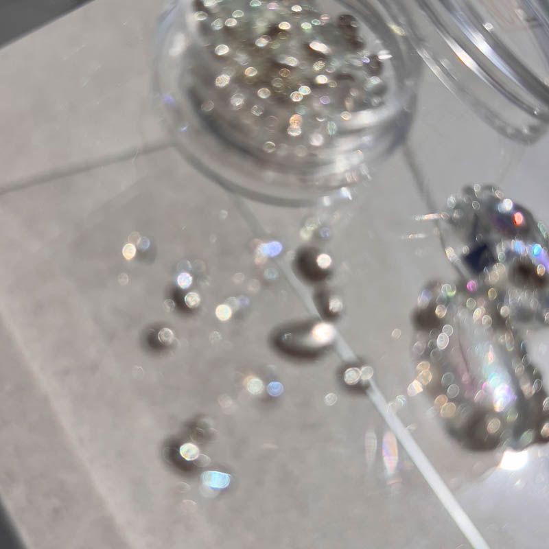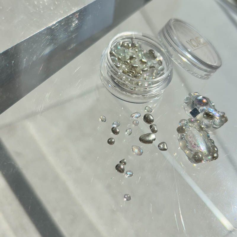 1.5~4mmくらいのサイズの不規則な形のオーロラとシルバーのガラスストーンがミックスされたアイテムです。
