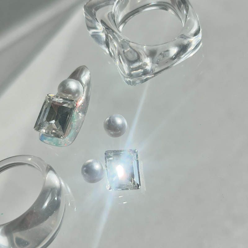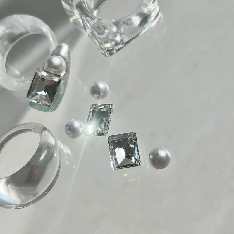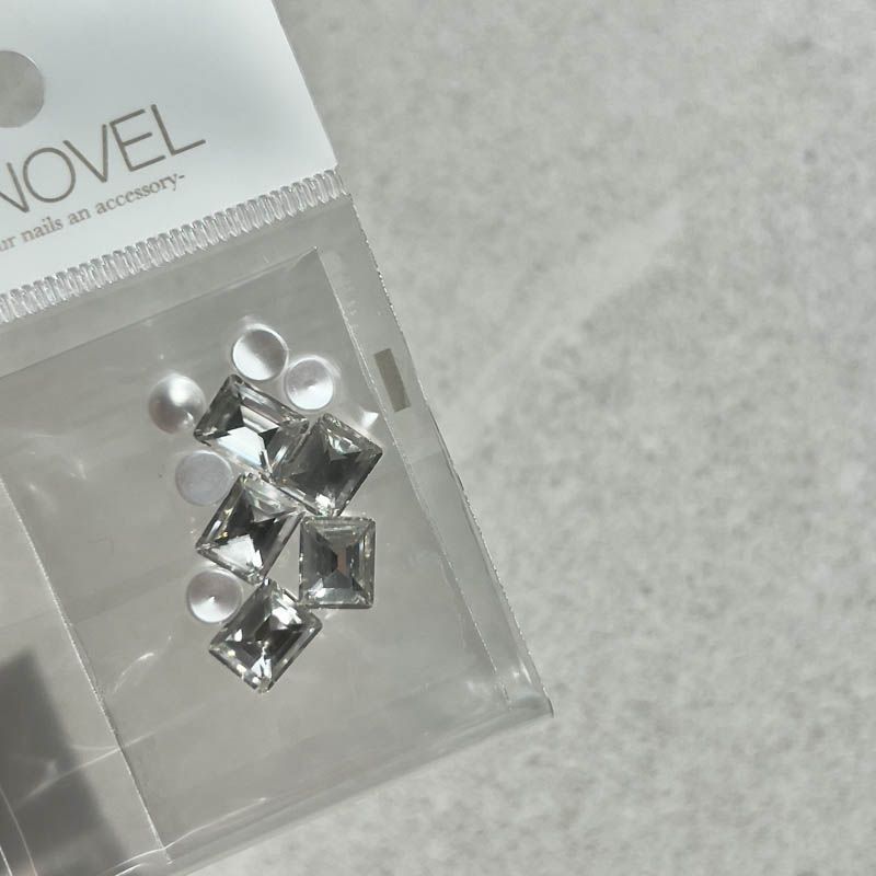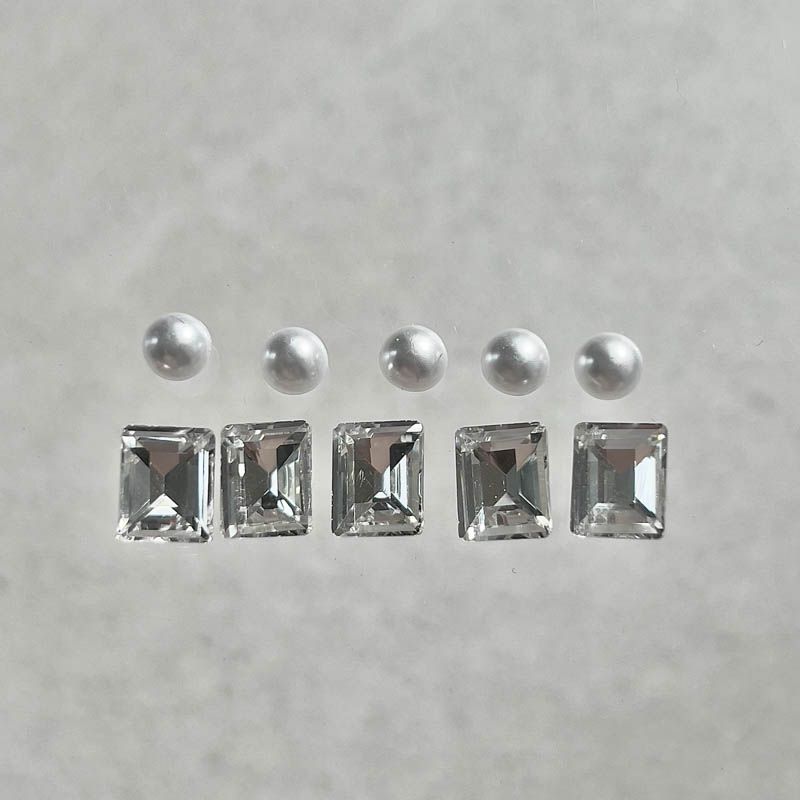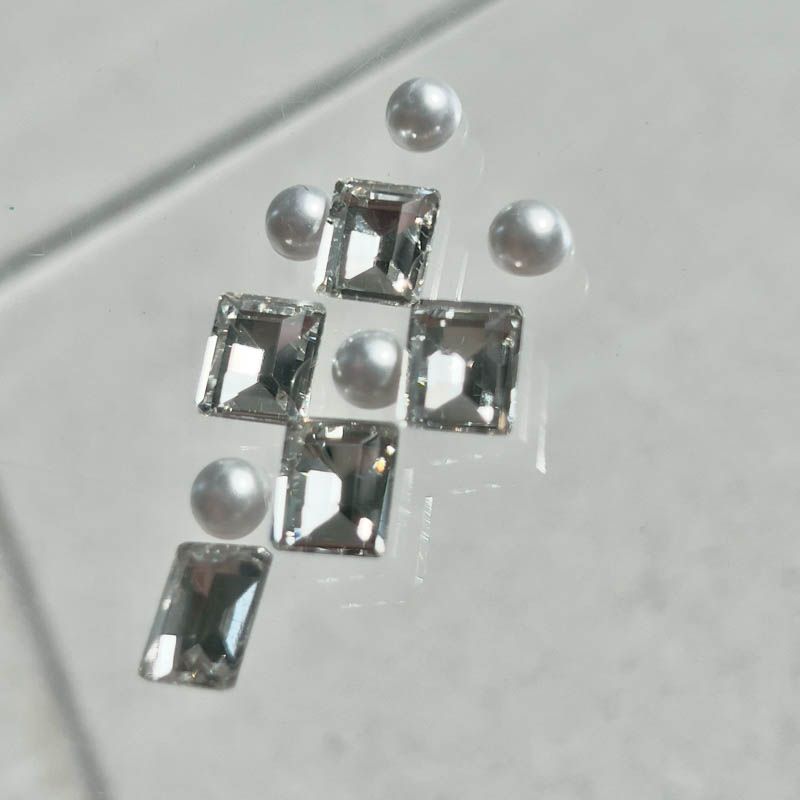 約8×10の長方形のクリスタルパーツと約5.5純白のブライトホワイトのカーブのついた使いやすいパールです。
