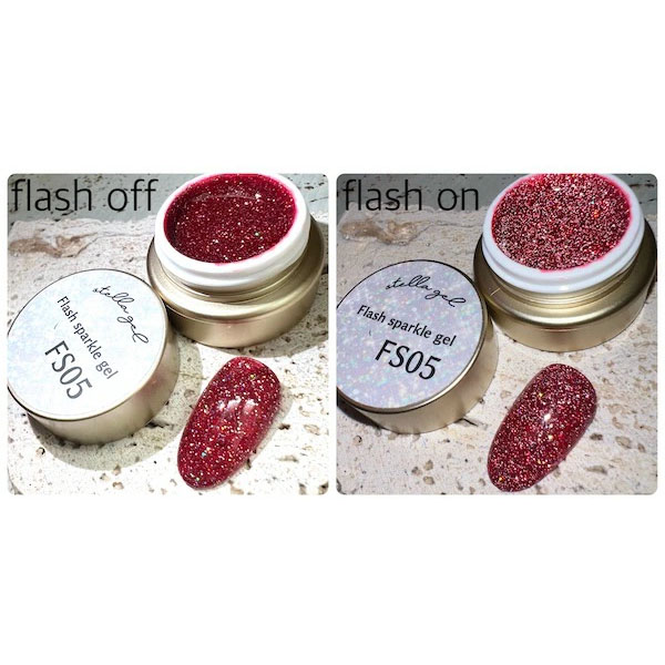ライトを当てたり、フラッシュ撮影時に更にラメが光るジェルになります。