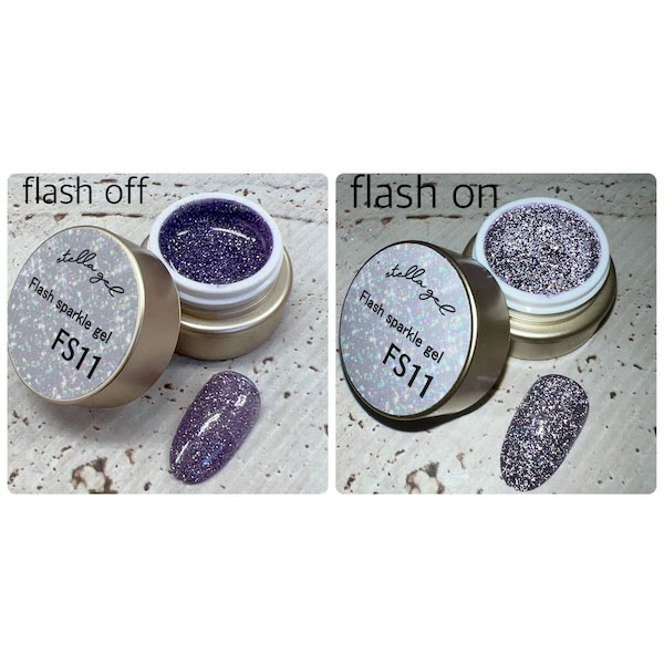 ライトを当てたり、フラッシュ撮影時に更にラメが光るジェルになります。