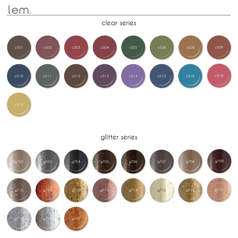 こだわりのくすみカラーから、個性引き立つグリッター、やわらかネオンカラーまで多岐に渡りながらも独特なlem.の世界観を作り出せる全てがこのセットで揃います。