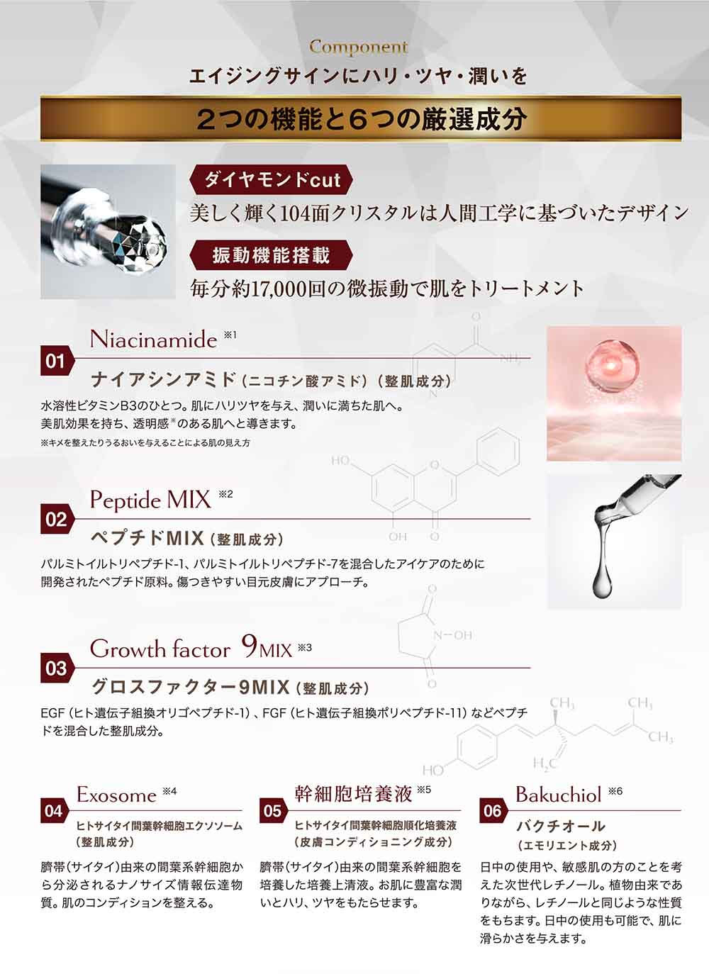 人間工学に基づいて開発された『104面のクリスタルCUT』のダイヤモンドボールのアプリケーターが表情筋をしっかり引き上げます。