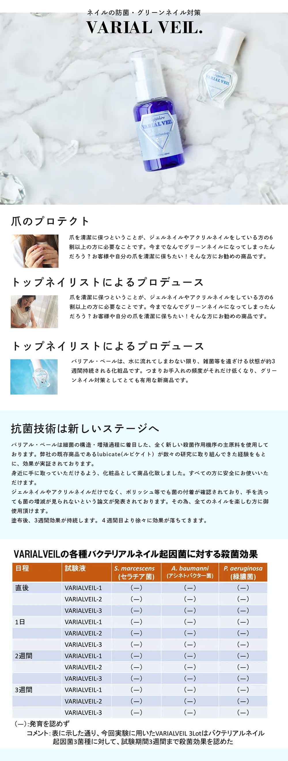 バリアル・ベールは、水に流れてしまわない限り、雑菌等を遠ざける状態が約3週間持続される化粧品です。つまりお手入れの頻度がそれだけ低くなり、グリーンネイル対策としてとても有用な新商品です。
