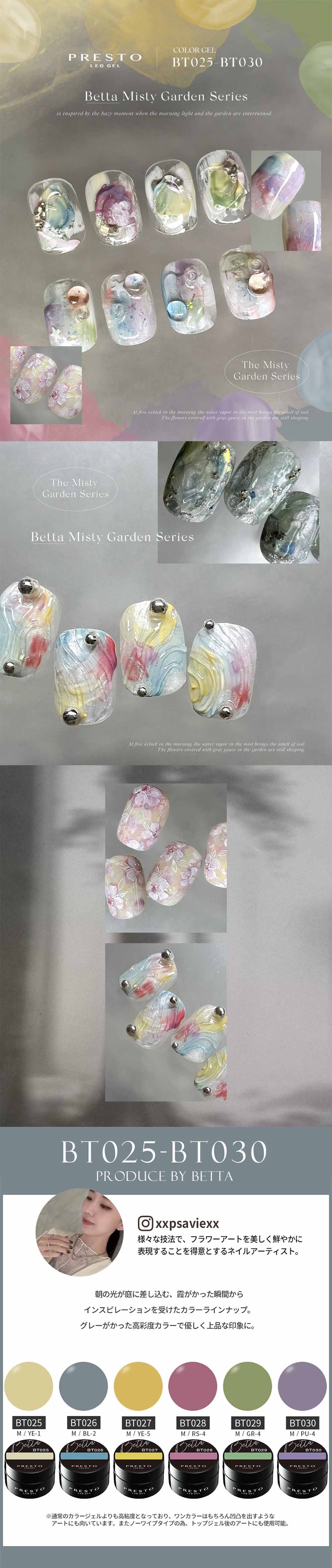 通常のカラージェルよりも高粘度となっており、ワンカラーはもちろん凹凸を出すようなアートにも向いています。