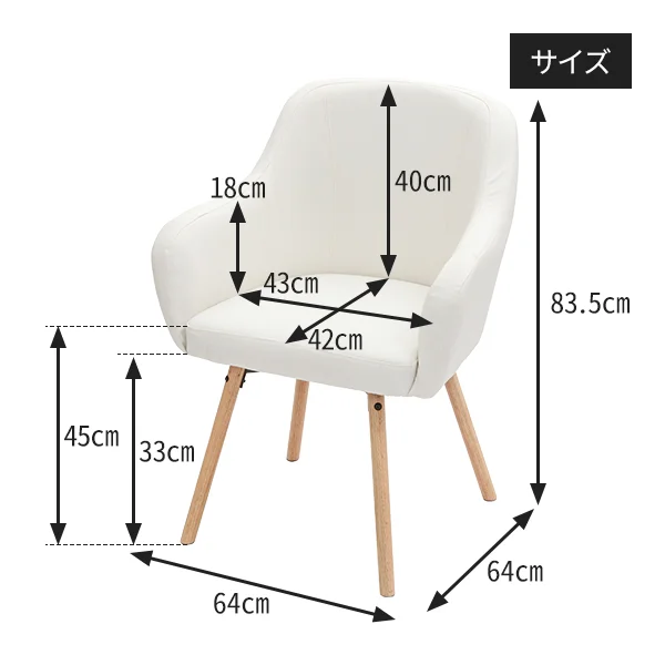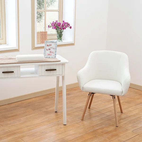 男性でもしっかりと腰を掛けやすい座面は幅43×奥行42×床上高さ45cmで、ネイルデスクやダイニングテーブルなどに合わせやすいサイズ感です。
