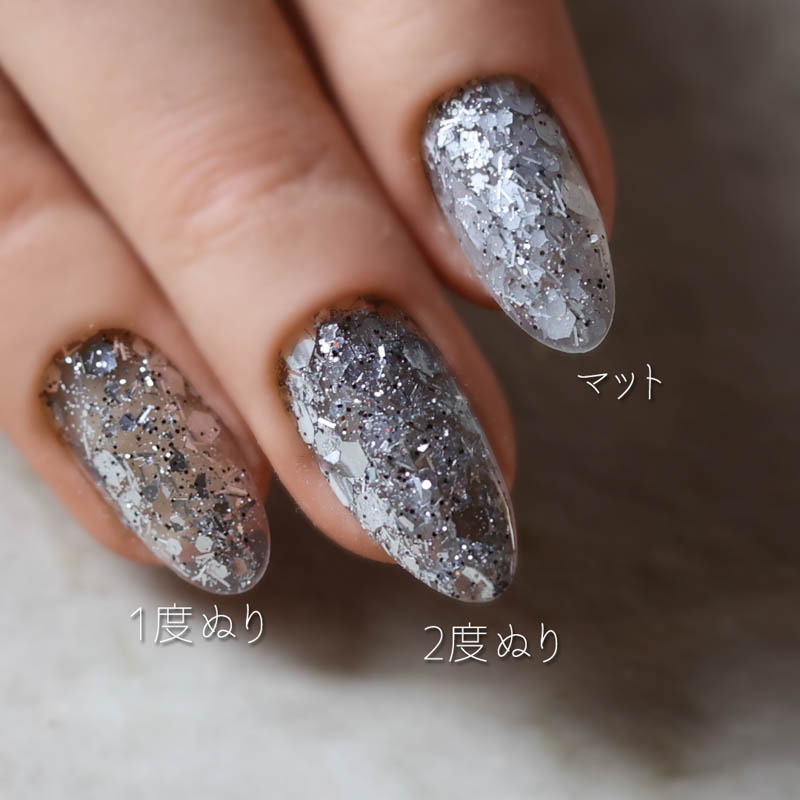ひと塗りで埋め尽くしたような密度感があり、万能に使える高輝度ラメ。