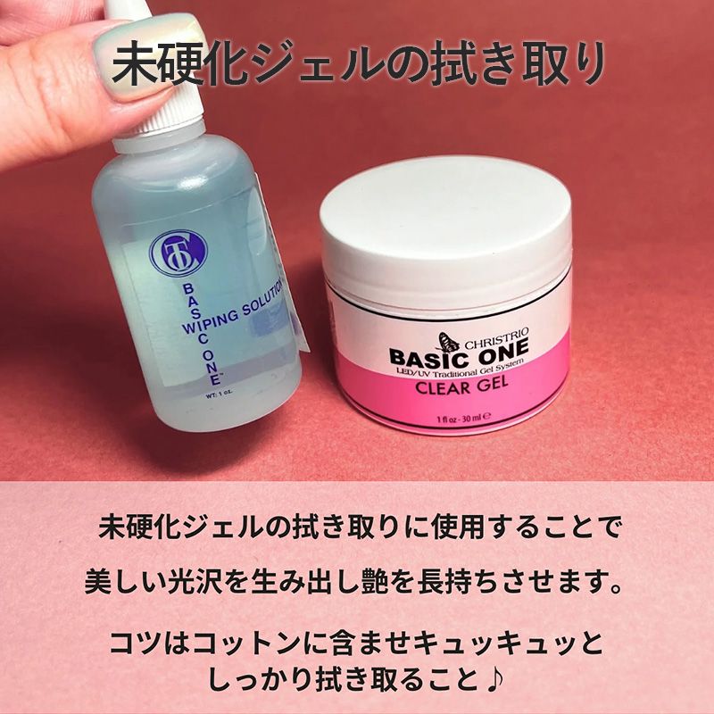 ・トップジェルの硬化後の未硬化ジェルの拭き取りに使うと、クリアの光沢度が一気に上がります。