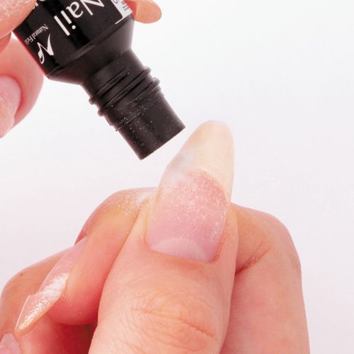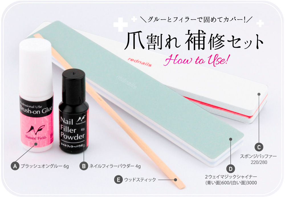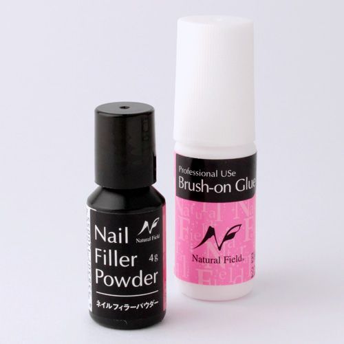 ブラッシュオングルー(瞬間接着剤)で爪を接着、ネイルフィラー(補修パウダー)で上から覆い、補強します。
