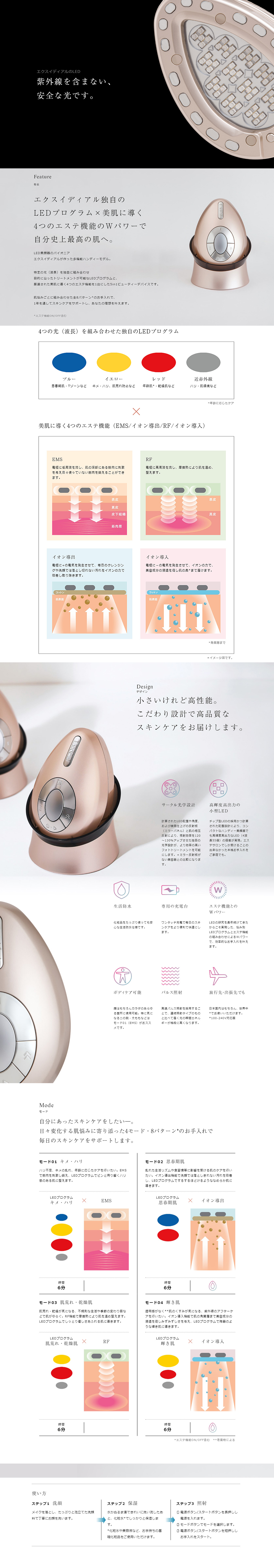 ◆人気商品「Exideal」の肌悩みに合わせた独自のLEDプログラムと、厳選された美肌に導く4つのエステ機能(EMS/イオン導出/RF/イオン導入)を1台にした5in1ビューティーデバイスです。