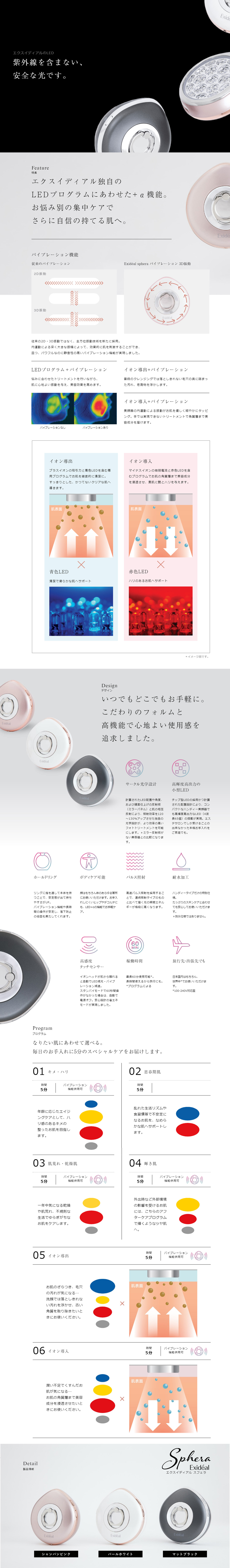 ◆人気商品「Exidal」の肌悩みに合わせた独自のLEDプログラムに加え、スフェラ専用プログラム(LED+イオン導出・LED+イオン導入)を搭載した全6プログラム。