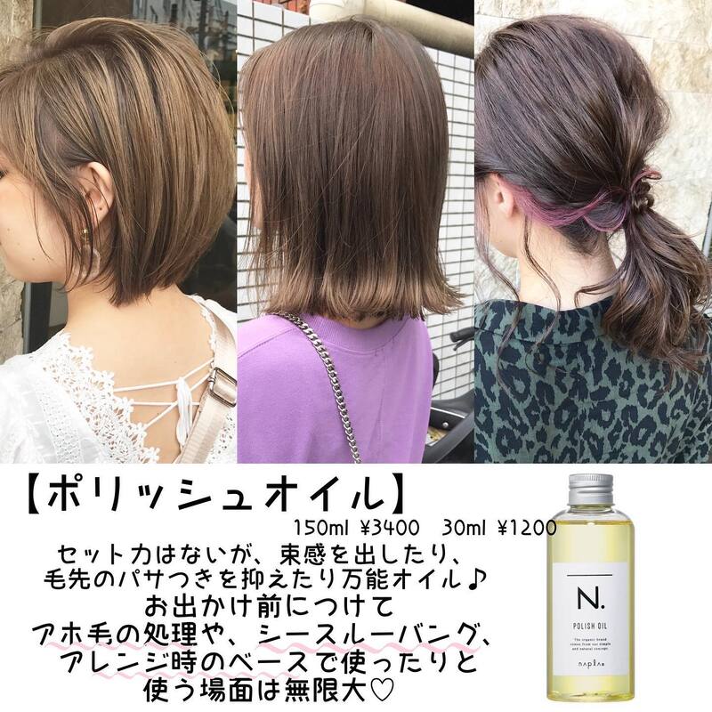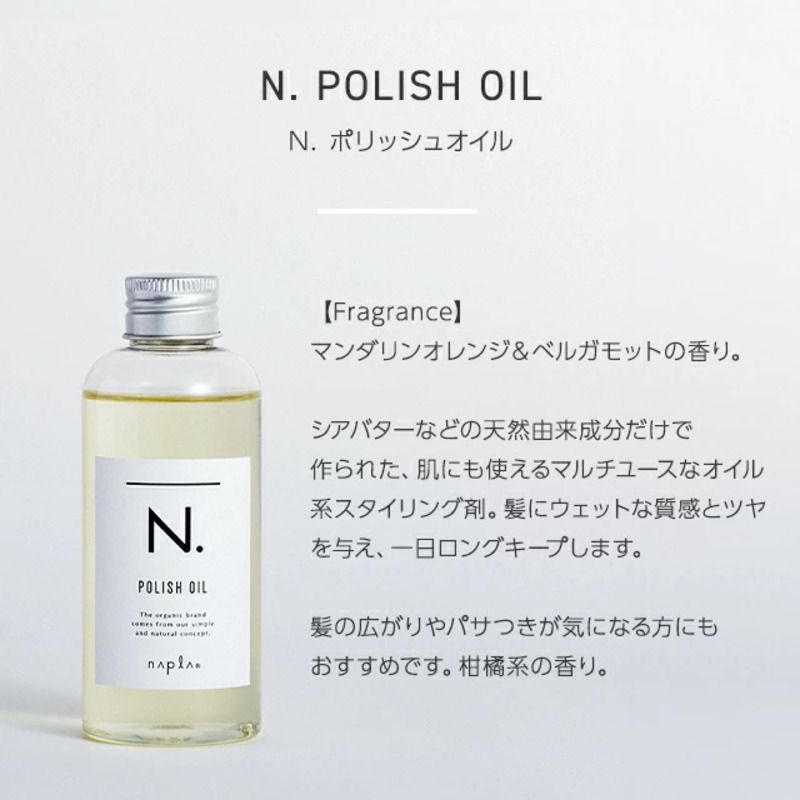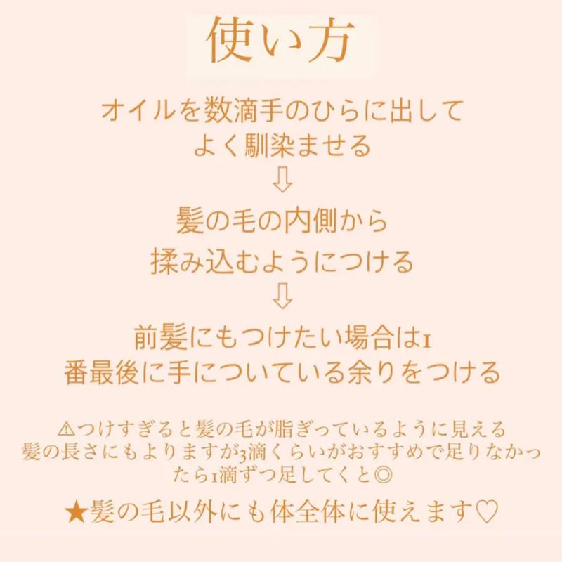 スタイリングの仕上げに毛先になじませると、ツヤ感とウェットな質感を与えてロングキープします。アウトバスオイルとして使用する場合は、タオルドライ後、適量を手のひらでよくのばして毛先中心になじませ、乾かして仕上げます。