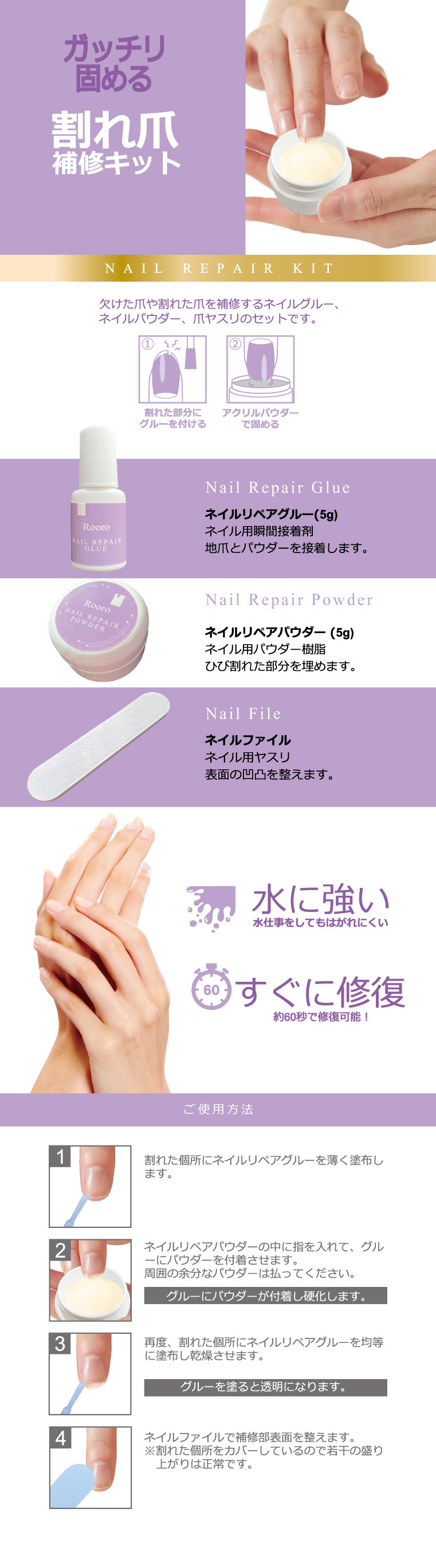 欠けた爪や割れた爪を補修するネイルグルー、ネイルパウダー、爪ヤスリのセット。