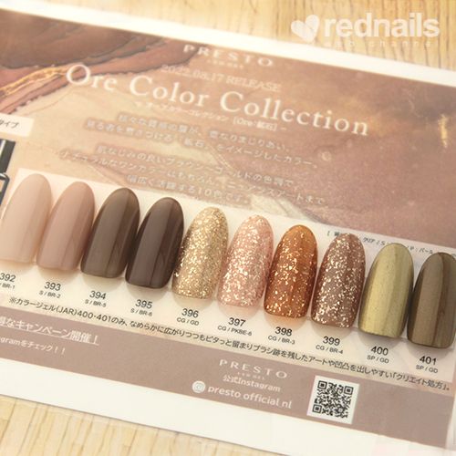 肌なじみの良いブラウン~ゴールドの色調でナチュラルなワンカラーはもちろん、ニュアンスアートまで幅広く活躍する10色です。