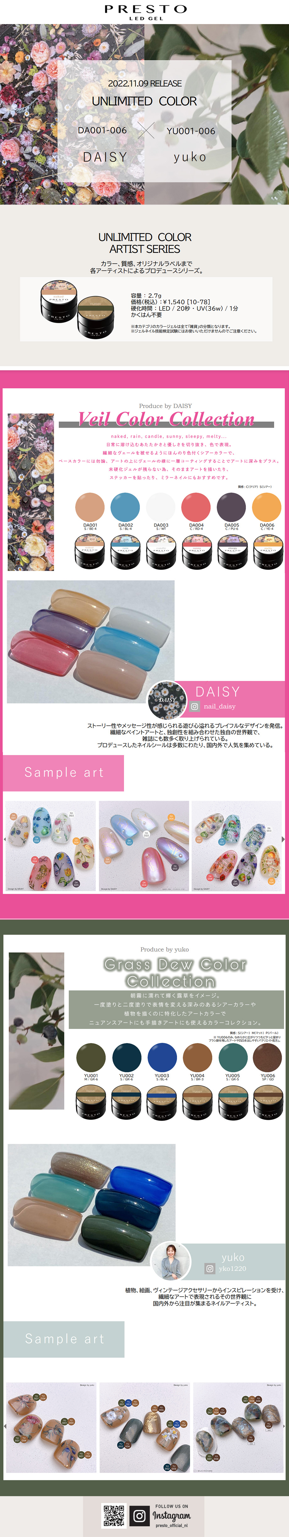 重ねることで表情を変える深みのあるシアーカラーと植物を描くのに特化したアートカラーの組み合わせで、ニュアンスアートから繊細な手描きアートまで幅広く使えます。