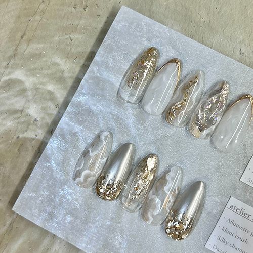 上品な色味の異素材ミックスグリッターで、長細いシャンパンホロがアクセントになっております。