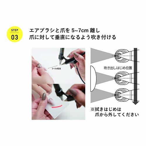 6. エアブラシと爪は適切な距離(5~7cm)を取り、爪に対して垂直になるようにして、吹き付ける