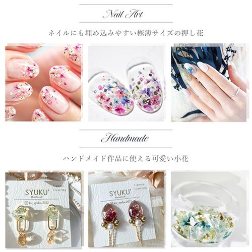 上品なネイルデザインやアクセサリーに仕上がるようイメージをして販売セットをご用意していますので、お花の種類によっては、花びらの大きさが揃っていないもの、花びらがかけたお花なども含まれます。