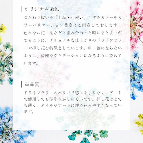 ドライフラワー・押し花につきましては、よくみられるビビッドカラーで、花びら全体がべっとり一色に染まっていて、シールのような鮮やかなドライフラワーではなく、リアルなお花をイメージして染色や加工をしていますので、お花の種類によっては、染色していないものや、色がムラに入っているもの、染まりすぎていない状態のものもございます。