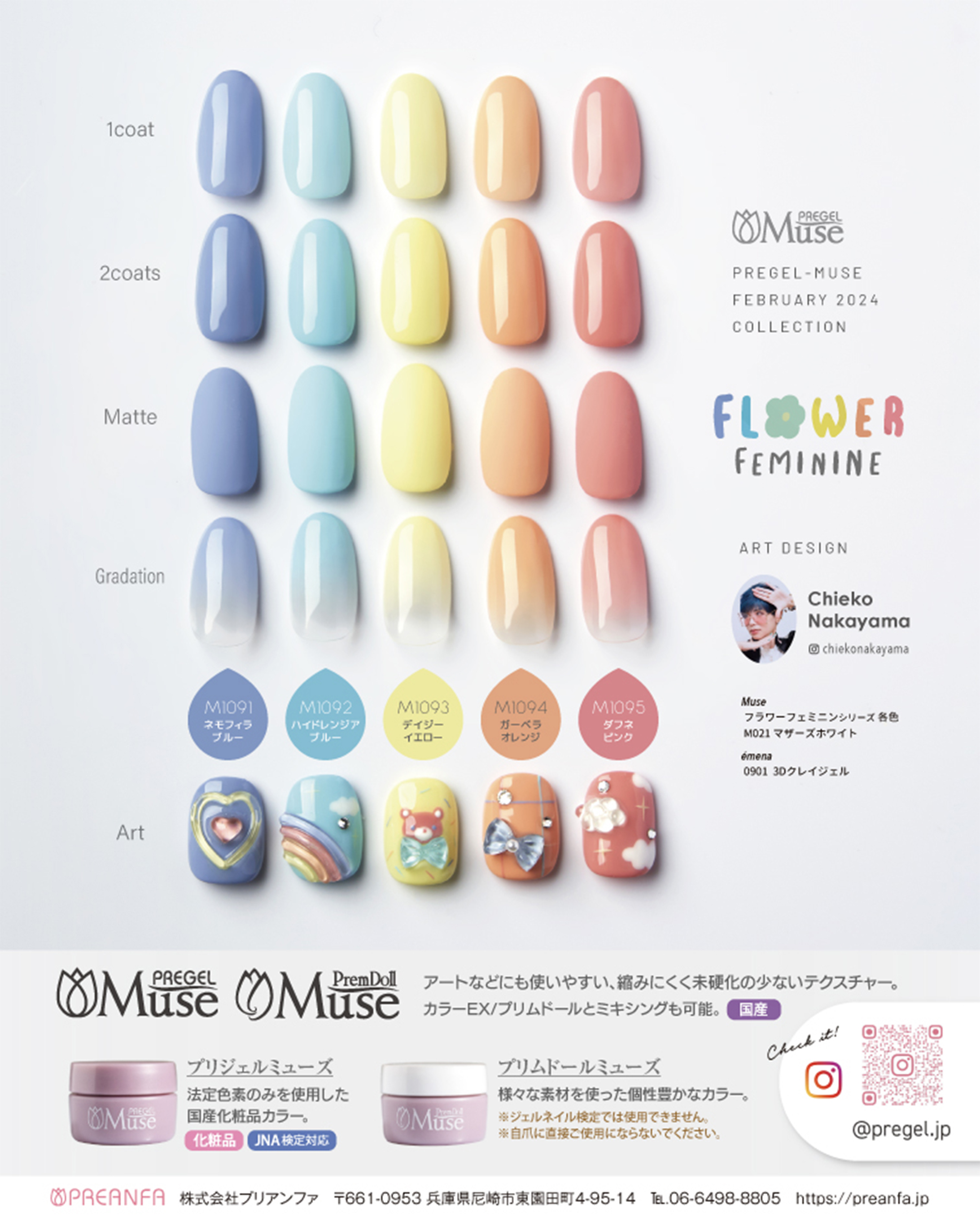 今回のミューズ「フラワーフェミニンシリーズ」は春ネイルにぴったりなカラーラインナップ5色。