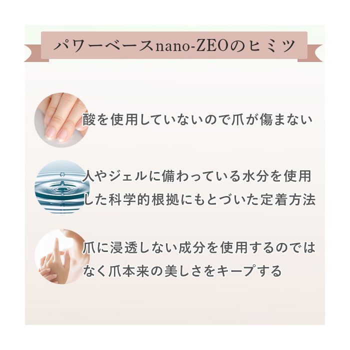 ※目に見えない残留物が爪表面に残っている可能性がありますので、特に他社ジェルからパワーベースに付け替える場合は爪表面を軽くサンディングしていただくと持ちが良くなります。